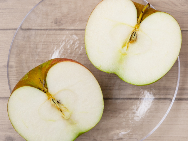 果肉はサクサクと歯ごたえのある食感 。サラダやスイーツ、料理のアクセントとして人気があり、焼いても形が崩れにくいのも魅力です。
